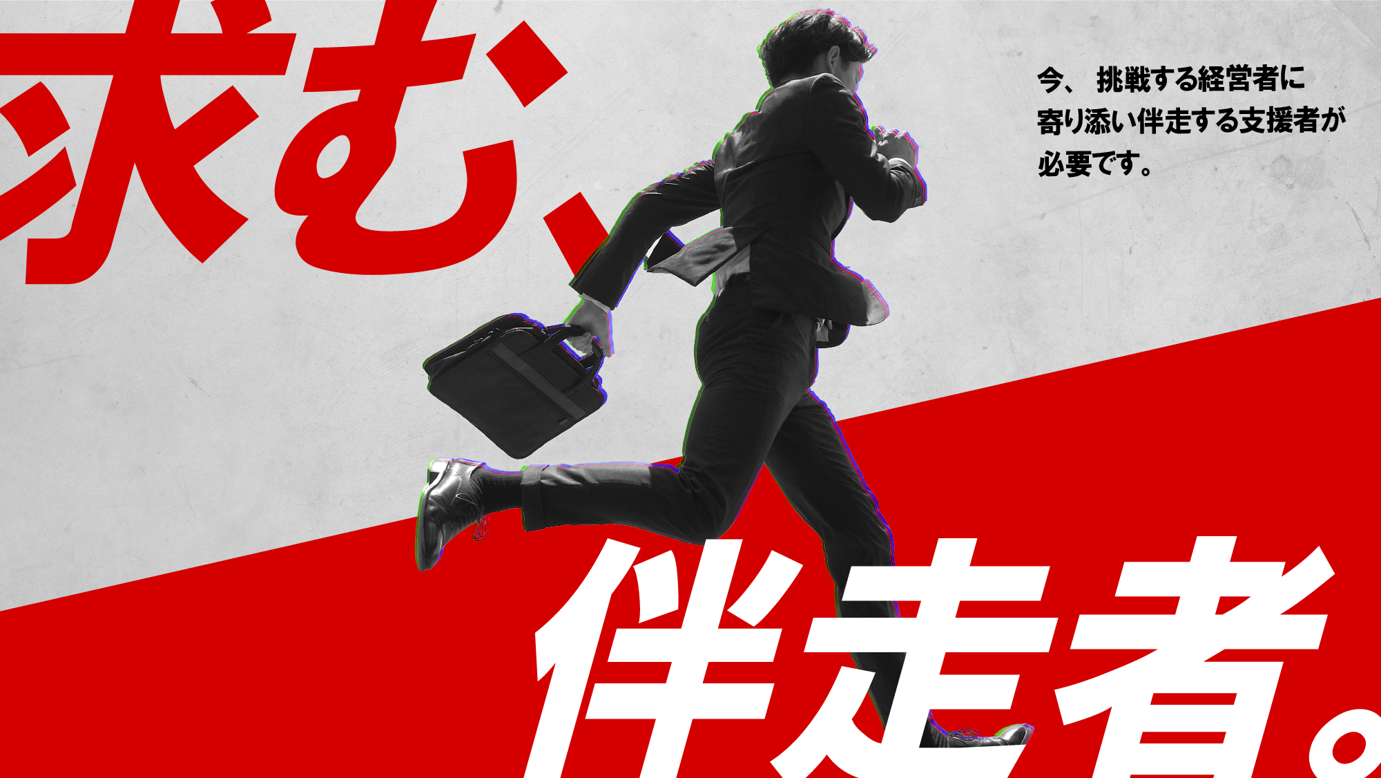 目的・課題と制作のポイント イメージの違う2つのビジュアルを用意したい 「伴走者求む」という力強いコピー、セミナーの情報を入れ込みたい デザイン①:コピーを入れた力強いデザイン デザイン②:セミナーの雰囲気が伝わるベーシックなデザイン 「伴走者求む」というコピーを倒置法にして、大きくデザイン的に配置することで勢いと力強さを表現 走り抜ける人のイメージをに色収差をつけることでエネルギーをと躍動感を表現 明るい青色を使用することでイメージの差別化、ビジネス向けセミナーの明るいイメージを表現 文字の情報が多いため、強調すべき文字を目に入れるためにそれ以外の文字の印象を色や文字色に変化を付けました デザイン① デザイン②
