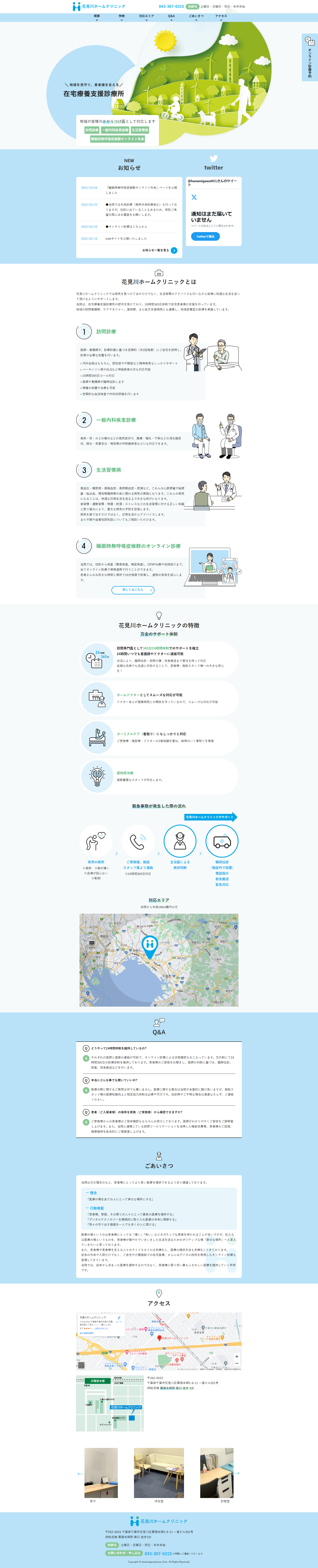 目的・課題と制作のポイント パンフレットのデザインに沿ったウェブサイトを作成してほしい パンフレットの雰囲気を踏襲しつつ、ウェブ用に再構成する パンフレットに使用されているイラストに近いテイストのイラストを使用 パンフレットは青と緑の両方のカラーが使われていたため、ベースは清潔感のある青を使用し、ポイントとして青と緑のグラデーションを使用しました クリニックの説明、特徴、緊急事態が発生した際の流れは、パンフレットの内容を再編成し、説明や図が見やすいようにしました トップページ(メインビジュアル、クリニックの説明) https://gocl.site/hanamigawahcl/ トップページ(特徴、緊急事態) https://gocl.site/hanamigawahcl/